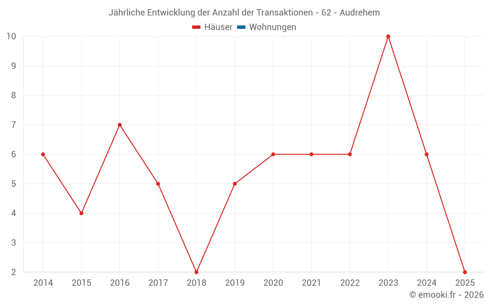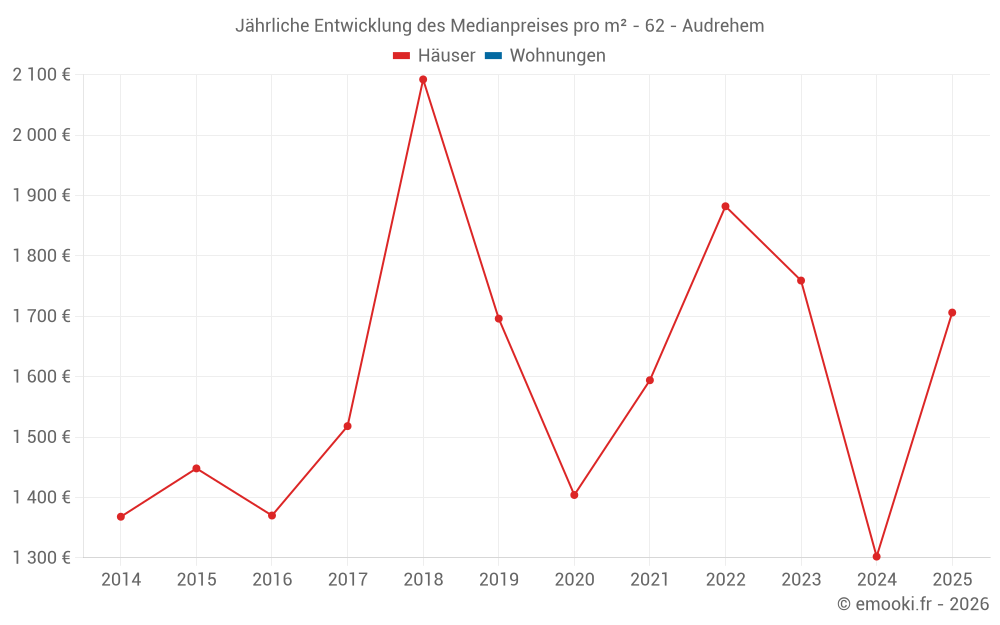 Der Durchschnittspreis auf den 14 Hausgeschäften der letzten 24 Monate in der Gemeinde Audrehem betrug 1 596 € pro Quadratmeter für einen mittleren Immobilienwert von 177 875 €. Über diesen Zeitraum hinweg lagen 60% der Transaktionen zwischen 958 und 2 604 € pro Quadratmeter (vom 2. bis zum 8. Dezil).