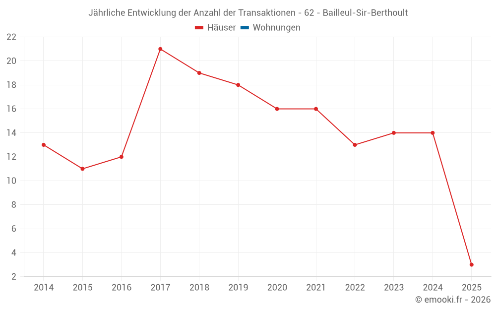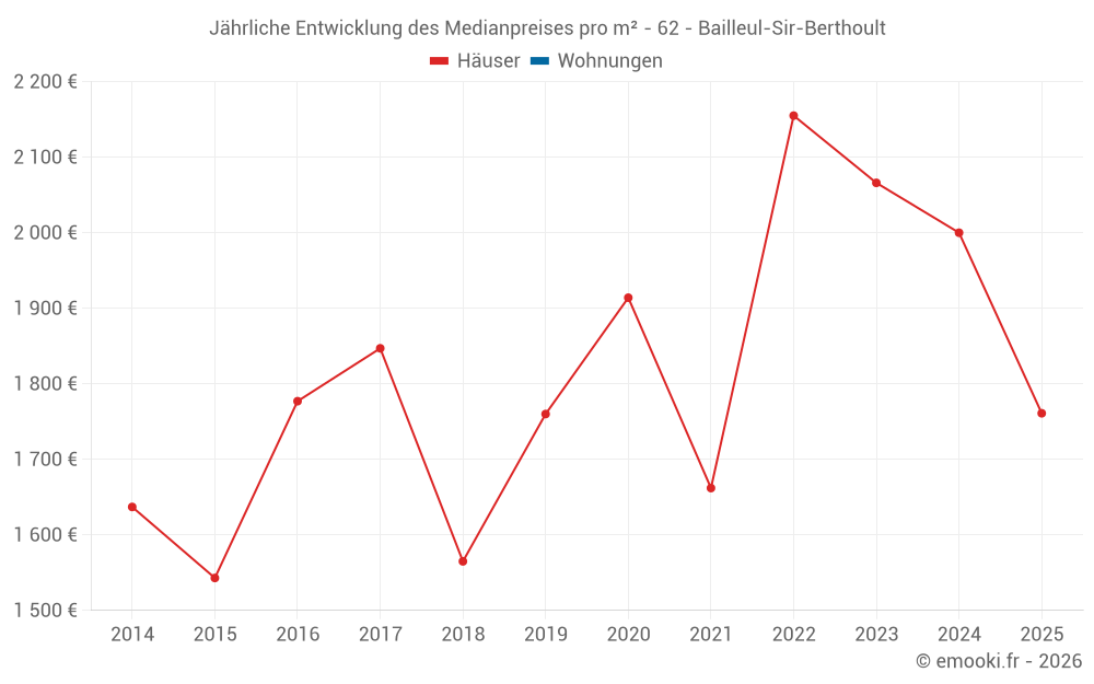 Der Durchschnittspreis auf den 25 Hausgeschäften der letzten 24 Monate in der Gemeinde Bailleul-Sir-Berthoult betrug 2 022 € pro Quadratmeter für einen mittleren Immobilienwert von 183 500 €. Über diesen Zeitraum hinweg lagen 60% der Transaktionen zwischen 1 708 und 2 295 € pro Quadratmeter (vom 2. bis zum 8. Dezil).