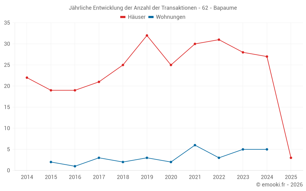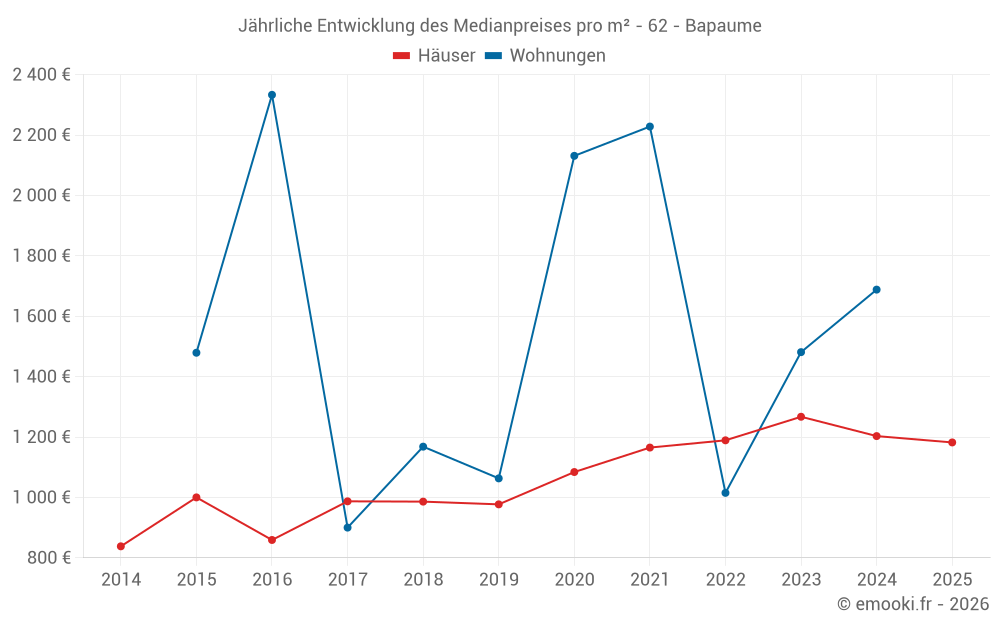 Der Durchschnittspreis auf den 17 Hausgeschäften der letzten 12 Monate in der Gemeinde Bapaume betrug 1 184 € pro Quadratmeter für einen mittleren Immobilienwert von 104 400 €. Über diesen Zeitraum hinweg lagen 60% der Transaktionen zwischen 938 und 1 736 € pro Quadratmeter (vom 2. bis zum 8. Dezil).