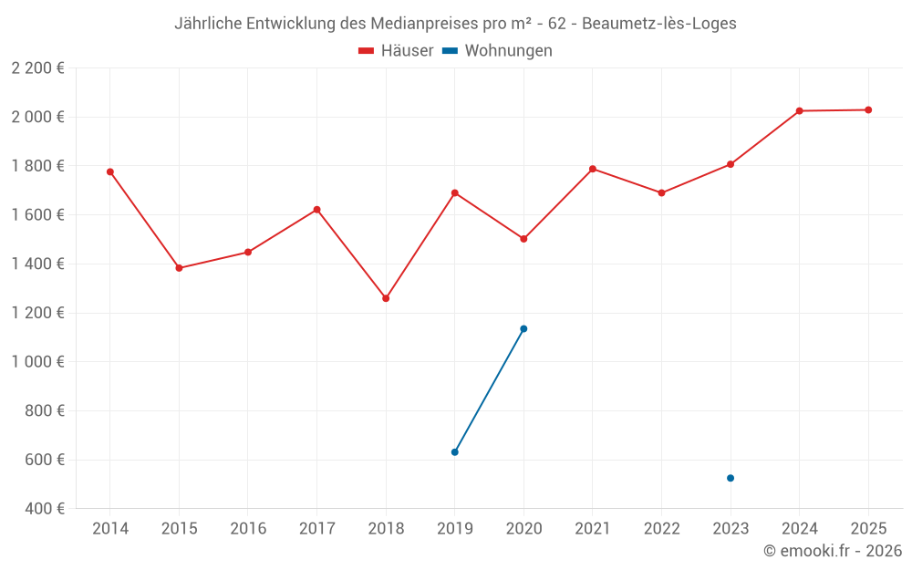 Der Durchschnittspreis auf den 26 Hausgeschäften der letzten 24 Monate in der Gemeinde Beaumetz-lès-Loges betrug 2 025 € pro Quadratmeter für einen mittleren Immobilienwert von 168 000 €. Über diesen Zeitraum hinweg lagen 60% der Transaktionen zwischen 1 807 und 2 060 € pro Quadratmeter (vom 2. bis zum 8. Dezil).