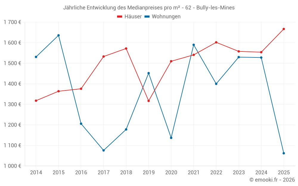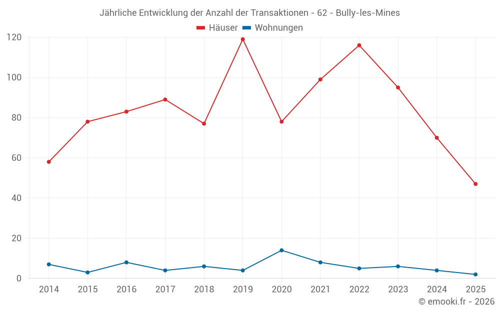Der Durchschnittspreis auf den 47 Hausgeschäften der letzten 6 Monate in der Gemeinde Bully-les-Mines betrug 1 667 € pro Quadratmeter für einen mittleren Immobilienwert von 160 000 €. Über diesen Zeitraum hinweg lagen 60% der Transaktionen zwischen 1 308 und 2 023 € pro Quadratmeter (vom 2. bis zum 8. Dezil).