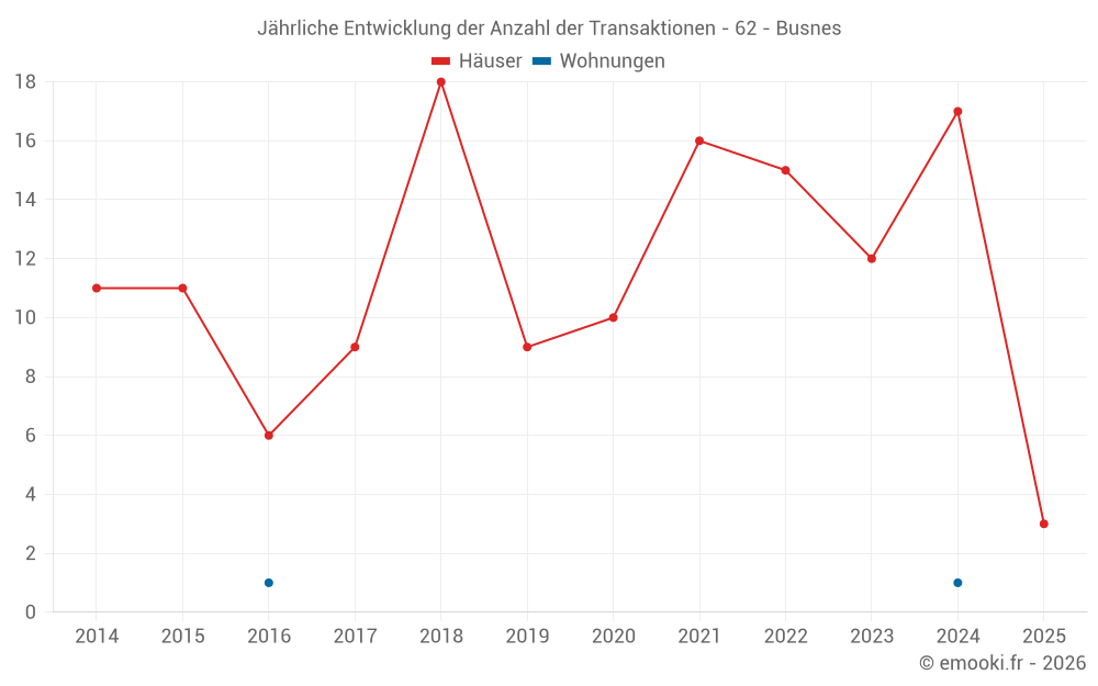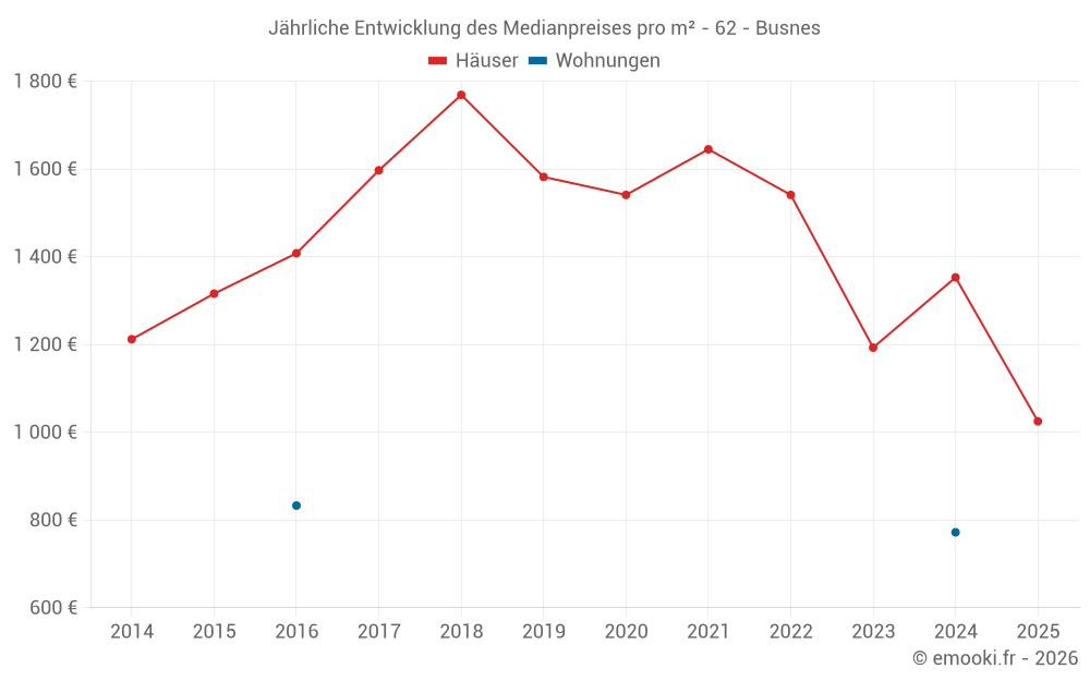 Der Durchschnittspreis auf den 28 Hausgeschäften der letzten 24 Monate in der Gemeinde Busnes betrug 1 230 € pro Quadratmeter für einen mittleren Immobilienwert von 144 870 €. Über diesen Zeitraum hinweg lagen 60% der Transaktionen zwischen 776 und 1 963 € pro Quadratmeter (vom 2. bis zum 8. Dezil).