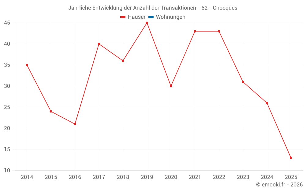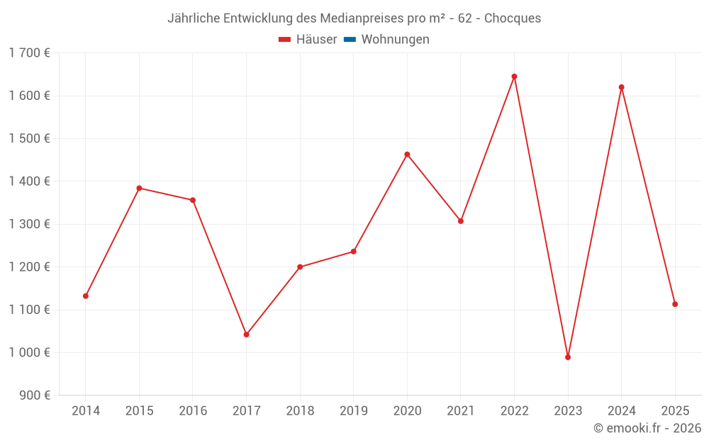 Der Durchschnittspreis auf den 29 Hausgeschäften der letzten 12 Monate in der Gemeinde Chocques betrug 1 556 € pro Quadratmeter für einen mittleren Immobilienwert von 138 000 €. Über diesen Zeitraum hinweg lagen 60% der Transaktionen zwischen 908 und 2 172 € pro Quadratmeter (vom 2. bis zum 8. Dezil).