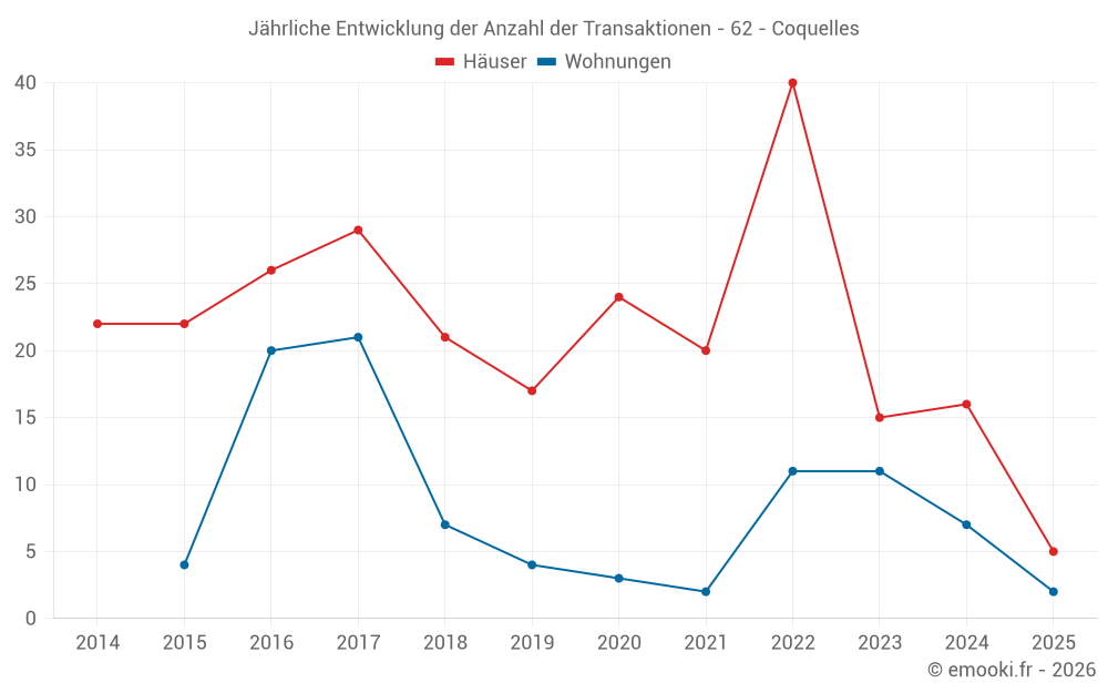 Der Durchschnittspreis auf den 29 Hausgeschäften der letzten 24 Monate in der Gemeinde Coquelles betrug 2 571 € pro Quadratmeter für einen mittleren Immobilienwert von 229 500 €. Über diesen Zeitraum hinweg lagen 60% der Transaktionen zwischen 1 731 und 2 826 € pro Quadratmeter (vom 2. bis zum 8. Dezil).