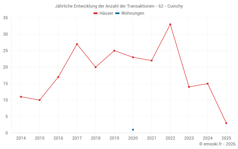 Der Durchschnittspreis auf den 26 Hausgeschäften der letzten 24 Monate in der Gemeinde Cuinchy betrug 1 764 € pro Quadratmeter für einen mittleren Immobilienwert von 174 750 €. Über diesen Zeitraum hinweg lagen 60% der Transaktionen zwischen 1 339 und 2 131 € pro Quadratmeter (vom 2. bis zum 8. Dezil).