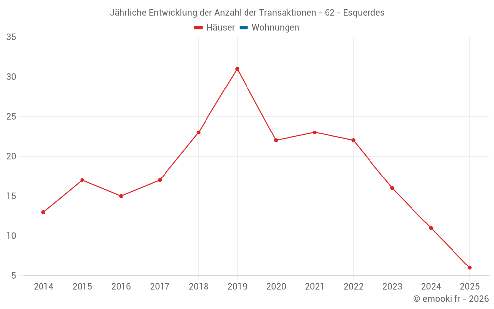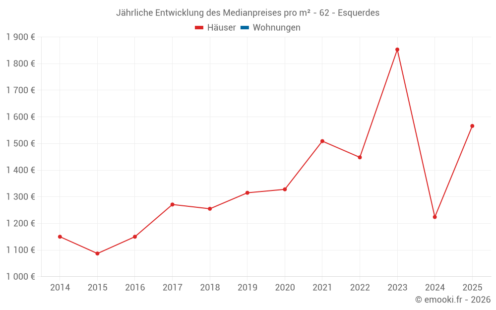 Der Durchschnittspreis auf den 26 Hausgeschäften der letzten 24 Monate in der Gemeinde Esquerdes betrug 1 496 € pro Quadratmeter für einen mittleren Immobilienwert von 145 280 €. Über diesen Zeitraum hinweg lagen 60% der Transaktionen zwischen 919 und 1 856 € pro Quadratmeter (vom 2. bis zum 8. Dezil).