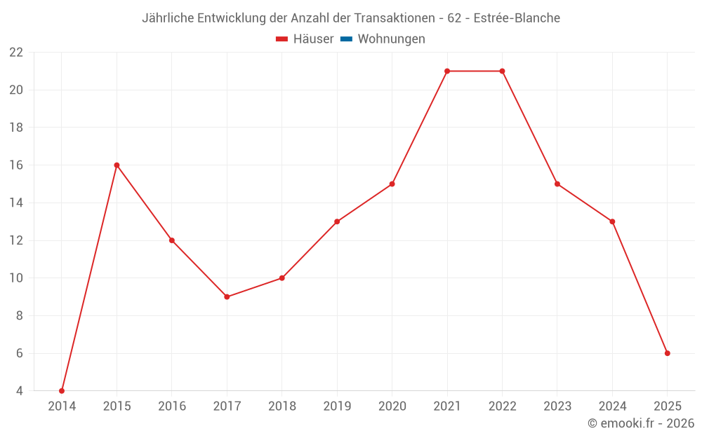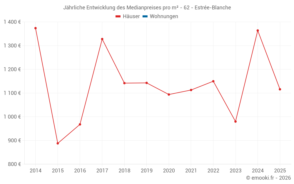 Der Durchschnittspreis auf den 24 Hausgeschäften der letzten 24 Monate in der Gemeinde Estrée-Blanche betrug 1 253 € pro Quadratmeter für einen mittleren Immobilienwert von 102 150 €. Über diesen Zeitraum hinweg lagen 60% der Transaktionen zwischen 577 und 1 675 € pro Quadratmeter (vom 2. bis zum 8. Dezil).