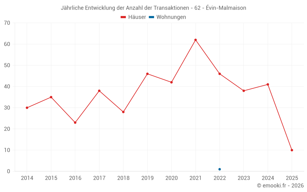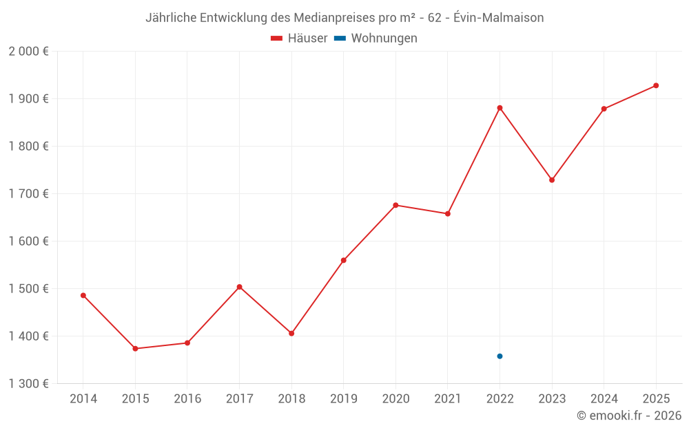 Der Durchschnittspreis auf den 35 Hausgeschäften der letzten 12 Monate in der Gemeinde Évin-Malmaison betrug 1 913 € pro Quadratmeter für einen mittleren Immobilienwert von 172 000 €. Über diesen Zeitraum hinweg lagen 60% der Transaktionen zwischen 1 585 und 2 430 € pro Quadratmeter (vom 2. bis zum 8. Dezil).