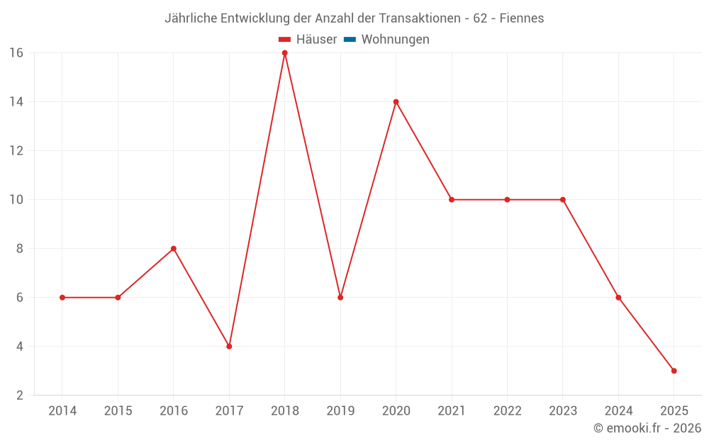 Der Durchschnittspreis auf den 16 Hausgeschäften der letzten 24 Monate in der Gemeinde Fiennes betrug 1 798 € pro Quadratmeter für einen mittleren Immobilienwert von 184 000 €. Über diesen Zeitraum hinweg lagen 60% der Transaktionen zwischen 860 und 2 312 € pro Quadratmeter (vom 2. bis zum 8. Dezil).
