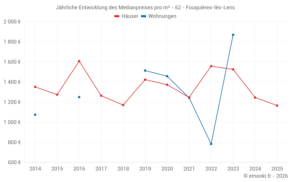 Der Durchschnittspreis auf den 18 Hausgeschäften der letzten 6 Monate in der Gemeinde Fouquières-lès-Lens betrug 1 166 € pro Quadratmeter für einen mittleren Immobilienwert von 124 000 €. Über diesen Zeitraum hinweg lagen 60% der Transaktionen zwischen 1 005 und 1 886 € pro Quadratmeter (vom 2. bis zum 8. Dezil).