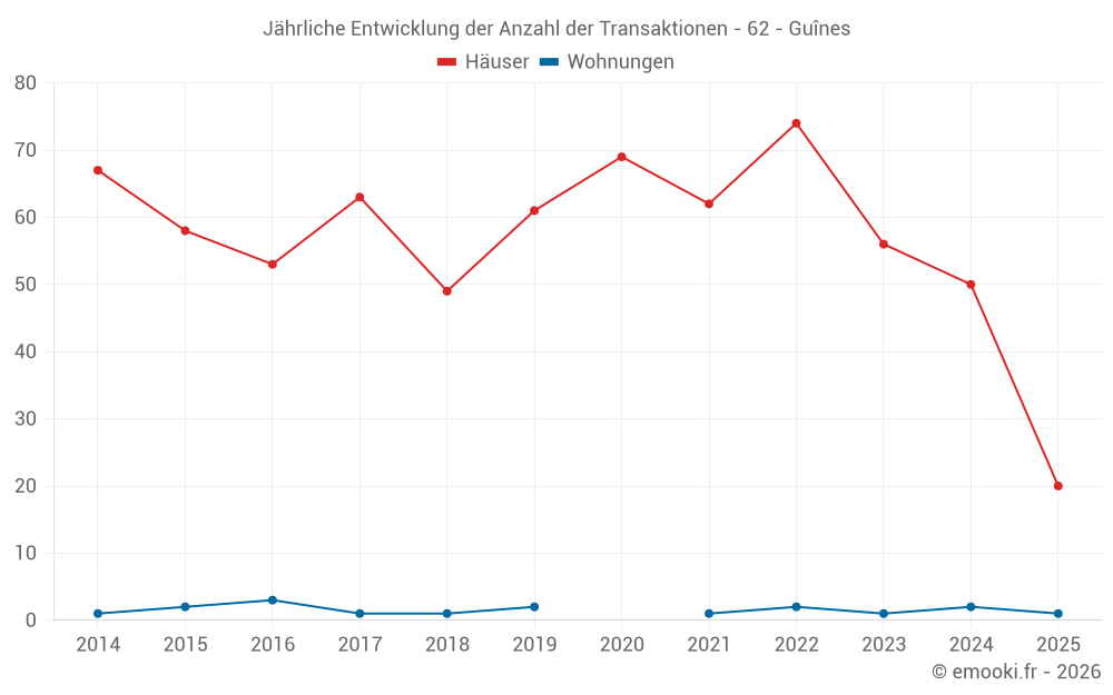 Der Durchschnittspreis auf den 20 Hausgeschäften der letzten 6 Monate in der Gemeinde Guînes betrug 1 310 € pro Quadratmeter für einen mittleren Immobilienwert von 132 950 €. Über diesen Zeitraum hinweg lagen 60% der Transaktionen zwischen 978 und 2 003 € pro Quadratmeter (vom 2. bis zum 8. Dezil).
