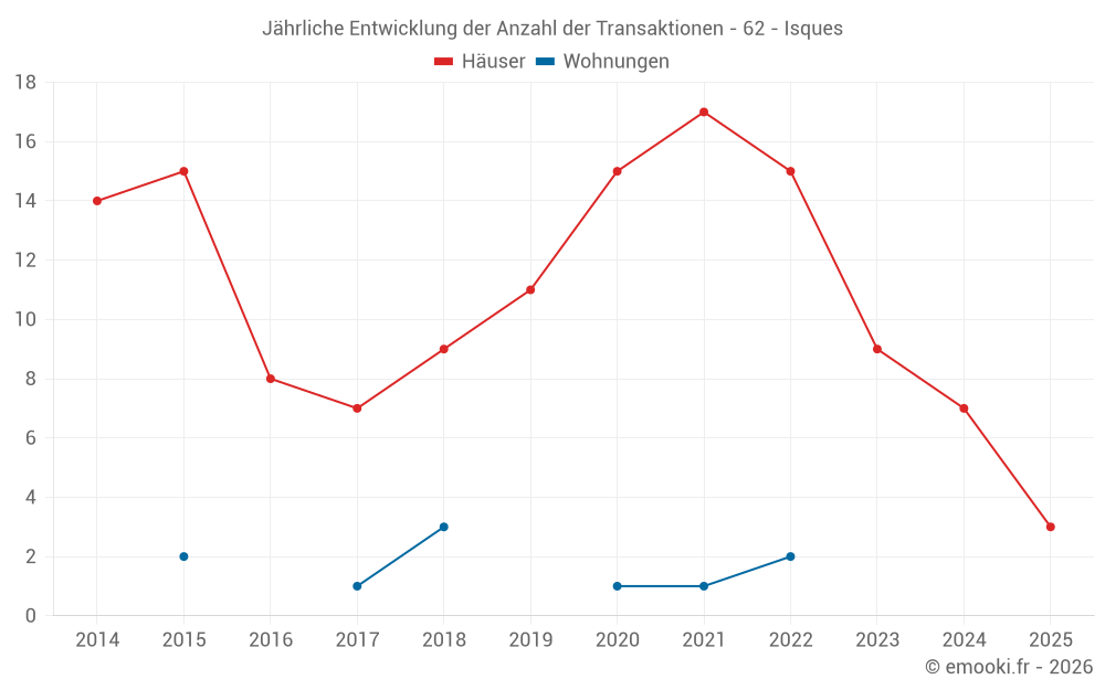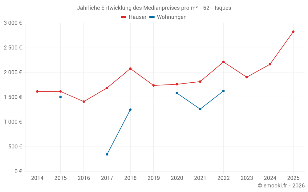 Der Durchschnittspreis auf den 14 Hausgeschäften der letzten 24 Monate in der Gemeinde Isques betrug 1 858 € pro Quadratmeter für einen mittleren Immobilienwert von 154 500 €. Über diesen Zeitraum hinweg lagen 60% der Transaktionen zwischen 1 118 und 2 455 € pro Quadratmeter (vom 2. bis zum 8. Dezil).