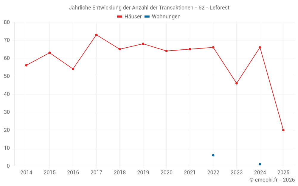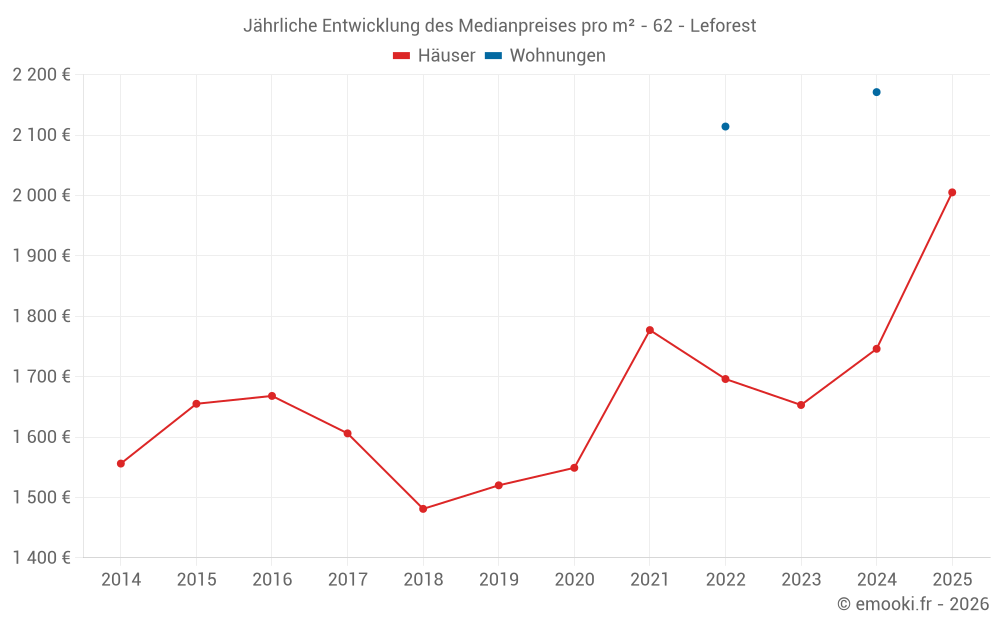 Der Durchschnittspreis auf den 20 Hausgeschäften der letzten 6 Monate in der Gemeinde Leforest betrug 2 005 € pro Quadratmeter für einen mittleren Immobilienwert von 154 000 €. Über diesen Zeitraum hinweg lagen 60% der Transaktionen zwischen 1 438 und 2 112 € pro Quadratmeter (vom 2. bis zum 8. Dezil).