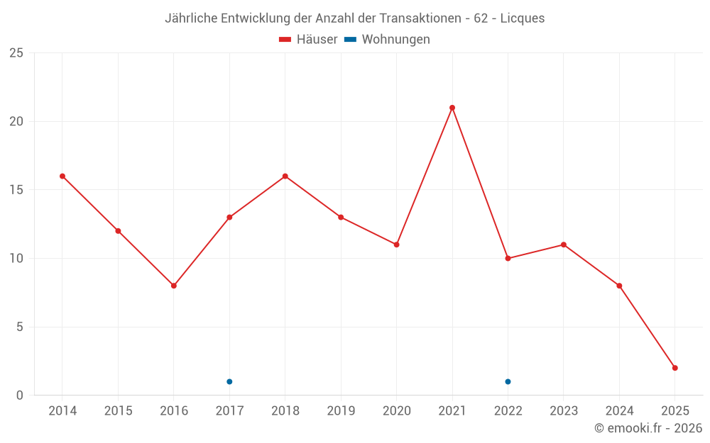 Der Durchschnittspreis auf den 14 Hausgeschäften der letzten 24 Monate in der Gemeinde Licques betrug 1 326 € pro Quadratmeter für einen mittleren Immobilienwert von 107 000 €. Über diesen Zeitraum hinweg lagen 60% der Transaktionen zwischen 1 083 und 1 819 € pro Quadratmeter (vom 2. bis zum 8. Dezil).