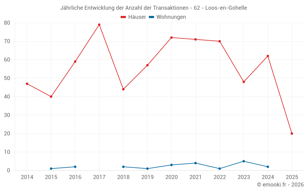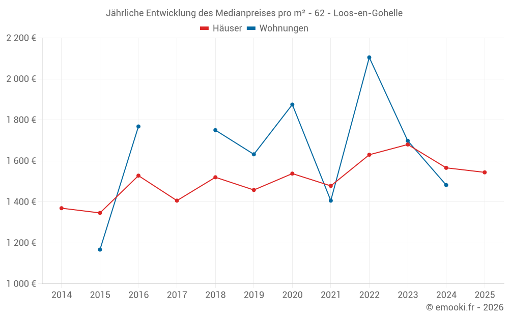 Der Durchschnittspreis auf den 20 Hausgeschäften der letzten 6 Monate in der Gemeinde Loos-en-Gohelle betrug 1 544 € pro Quadratmeter für einen mittleren Immobilienwert von 132 900 €. Über diesen Zeitraum hinweg lagen 60% der Transaktionen zwischen 1 354 und 1 710 € pro Quadratmeter (vom 2. bis zum 8. Dezil).