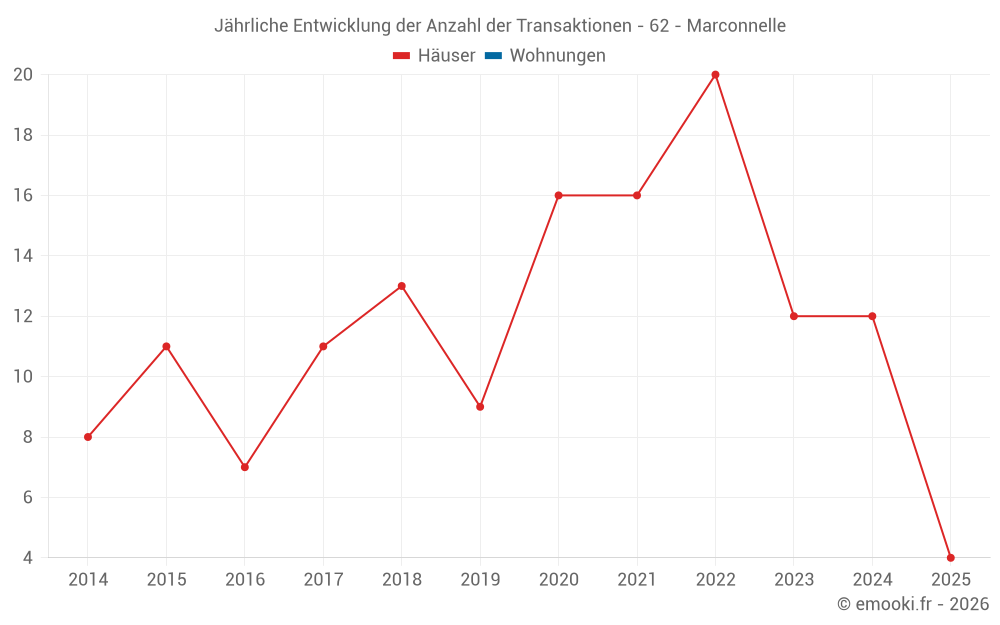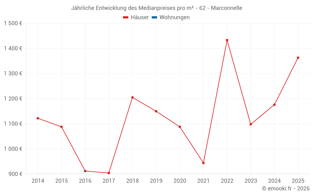 Der Durchschnittspreis auf den 24 Hausgeschäften der letzten 24 Monate in der Gemeinde Marconnelle betrug 1 152 € pro Quadratmeter für einen mittleren Immobilienwert von 123 000 €. Über diesen Zeitraum hinweg lagen 60% der Transaktionen zwischen 788 und 1 455 € pro Quadratmeter (vom 2. bis zum 8. Dezil).