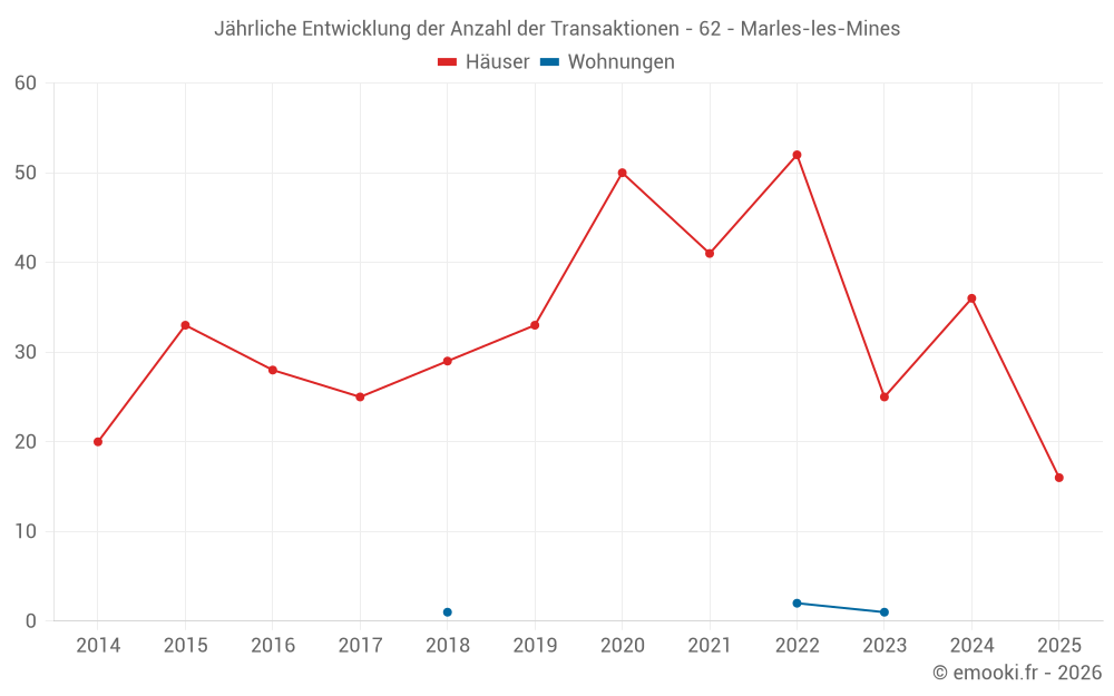 Der Durchschnittspreis auf den 38 Hausgeschäften der letzten 12 Monate in der Gemeinde Marles-les-Mines betrug 1 216 € pro Quadratmeter für einen mittleren Immobilienwert von 94 750 €. Über diesen Zeitraum hinweg lagen 60% der Transaktionen zwischen 944 und 1 741 € pro Quadratmeter (vom 2. bis zum 8. Dezil).