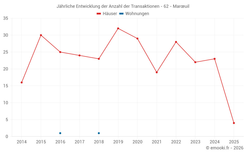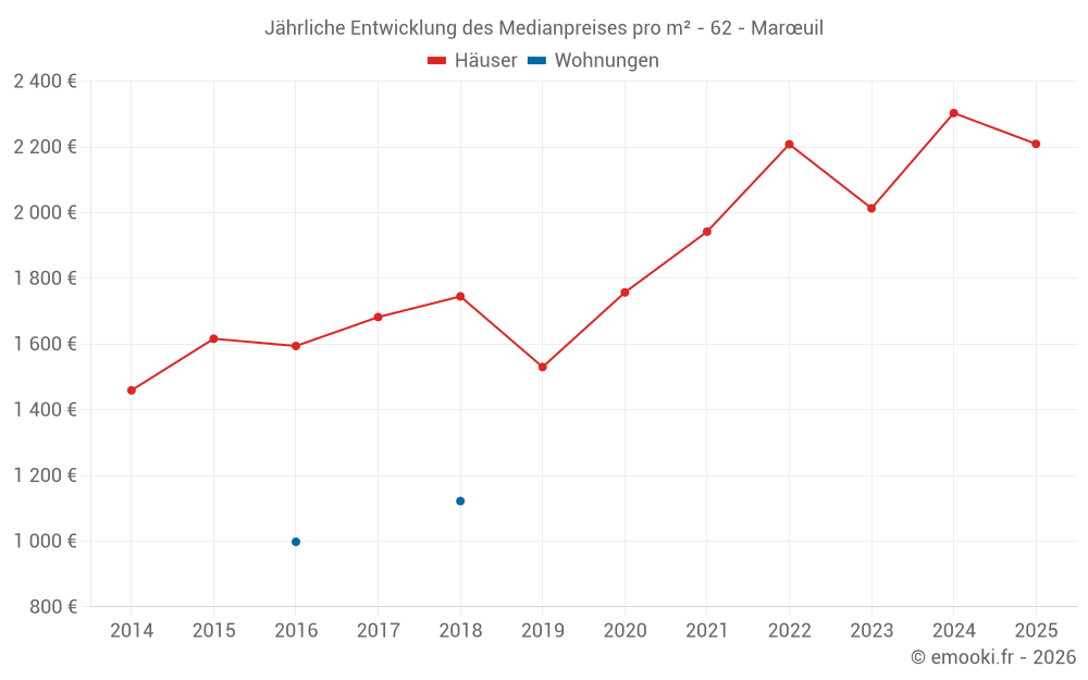Der Durchschnittspreis auf den 17 Hausgeschäften der letzten 12 Monate in der Gemeinde Marœuil betrug 2 303 € pro Quadratmeter für einen mittleren Immobilienwert von 211 000 €. Über diesen Zeitraum hinweg lagen 60% der Transaktionen zwischen 1 784 und 2 489 € pro Quadratmeter (vom 2. bis zum 8. Dezil).