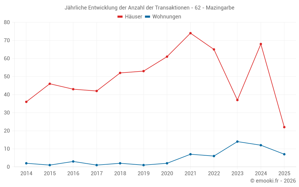 Der Durchschnittspreis auf den 22 Hausgeschäften der letzten 6 Monate in der Gemeinde Mazingarbe betrug 1 454 € pro Quadratmeter für einen mittleren Immobilienwert von 133 000 €. Über diesen Zeitraum hinweg lagen 60% der Transaktionen zwischen 1 020 und 1 915 € pro Quadratmeter (vom 2. bis zum 8. Dezil).