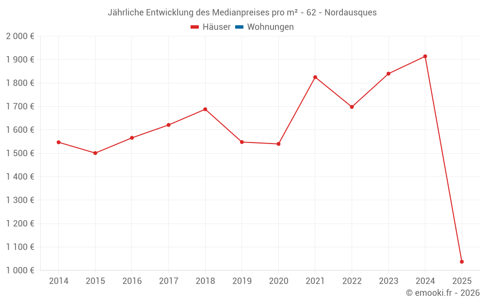 Der Durchschnittspreis auf den 15 Hausgeschäften der letzten 24 Monate in der Gemeinde Nordausques betrug 1 840 € pro Quadratmeter für einen mittleren Immobilienwert von 170 000 €. Über diesen Zeitraum hinweg lagen 60% der Transaktionen zwischen 1 504 und 2 198 € pro Quadratmeter (vom 2. bis zum 8. Dezil).