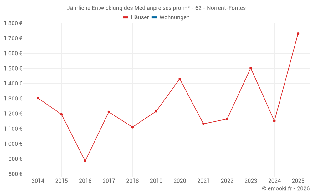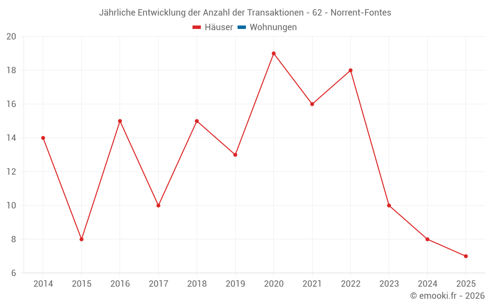 Der Durchschnittspreis auf den 20 Hausgeschäften der letzten 24 Monate in der Gemeinde Norrent-Fontes betrug 1 486 € pro Quadratmeter für einen mittleren Immobilienwert von 152 500 €. Über diesen Zeitraum hinweg lagen 60% der Transaktionen zwischen 734 und 2 159 € pro Quadratmeter (vom 2. bis zum 8. Dezil).