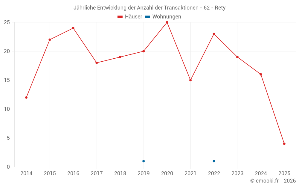 Der Durchschnittspreis auf den 32 Hausgeschäften der letzten 24 Monate in der Gemeinde Rety betrug 1 554 € pro Quadratmeter für einen mittleren Immobilienwert von 151 500 €. Über diesen Zeitraum hinweg lagen 60% der Transaktionen zwischen 1 183 und 2 191 € pro Quadratmeter (vom 2. bis zum 8. Dezil).