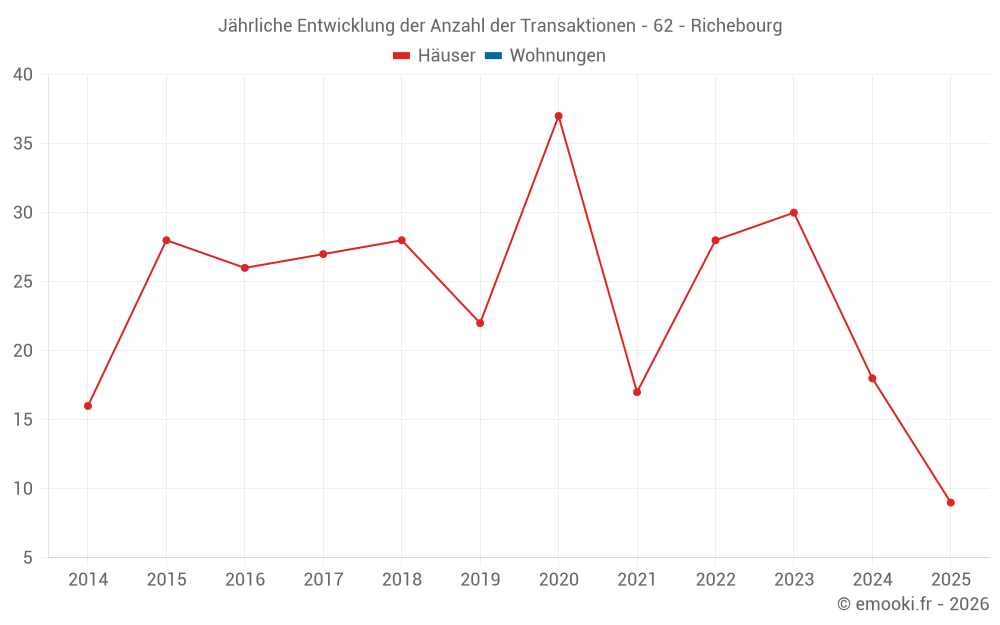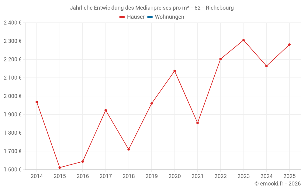 Der Durchschnittspreis auf den 21 Hausgeschäften der letzten 12 Monate in der Gemeinde Richebourg betrug 2 257 € pro Quadratmeter für einen mittleren Immobilienwert von 245 000 €. Über diesen Zeitraum hinweg lagen 60% der Transaktionen zwischen 1 555 und 2 779 € pro Quadratmeter (vom 2. bis zum 8. Dezil).