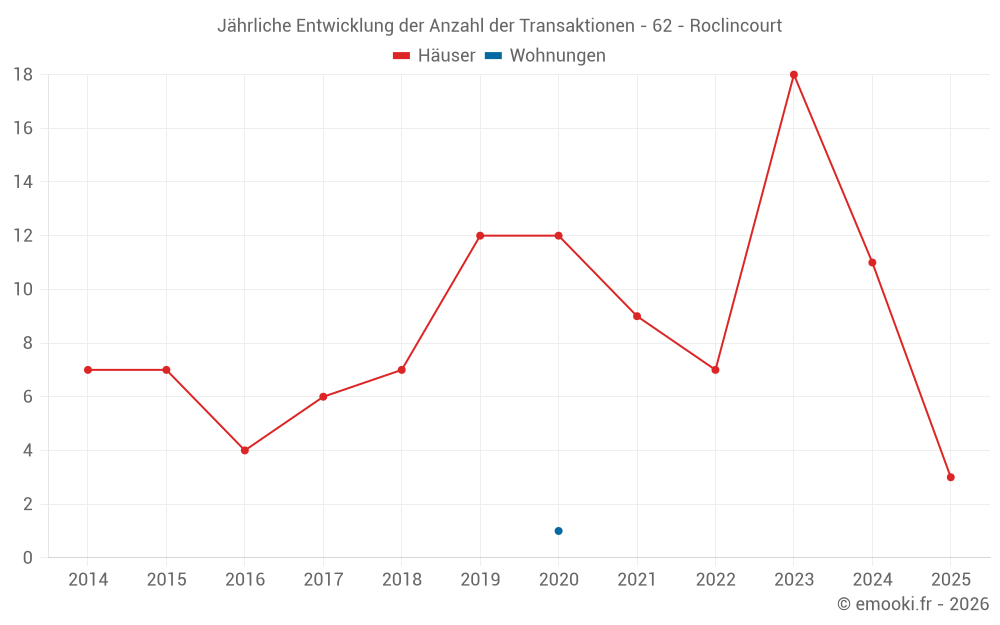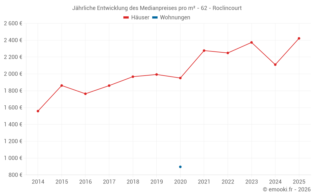 Der Durchschnittspreis auf den 26 Hausgeschäften der letzten 24 Monate in der Gemeinde Roclincourt betrug 2 198 € pro Quadratmeter für einen mittleren Immobilienwert von 215 065 €. Über diesen Zeitraum hinweg lagen 60% der Transaktionen zwischen 1 897 und 2 640 € pro Quadratmeter (vom 2. bis zum 8. Dezil).