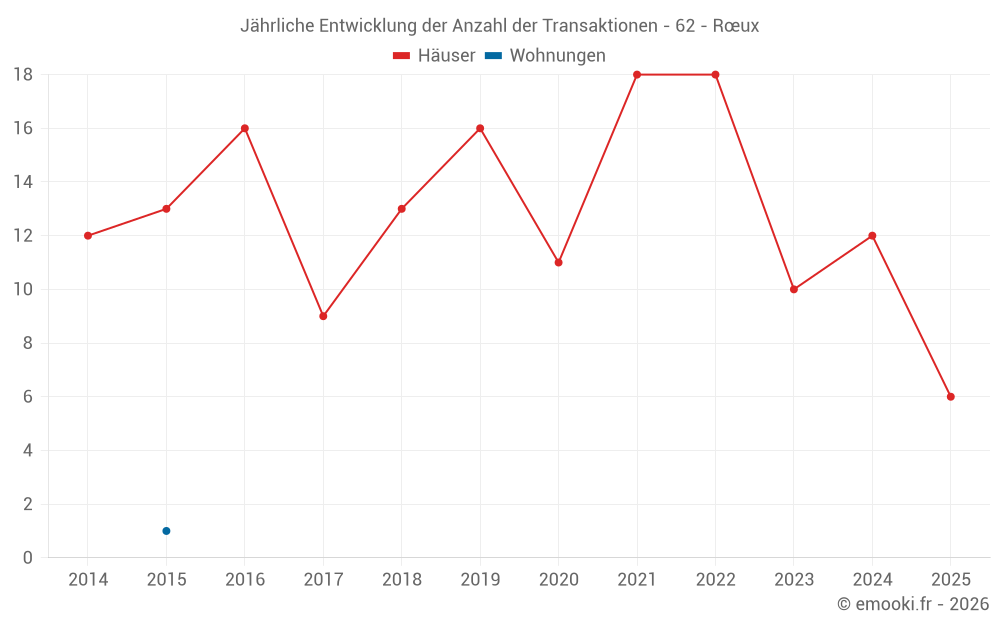 Der Durchschnittspreis auf den 25 Hausgeschäften der letzten 24 Monate in der Gemeinde Rœux betrug 1 813 € pro Quadratmeter für einen mittleren Immobilienwert von 168 000 €. Über diesen Zeitraum hinweg lagen 60% der Transaktionen zwischen 1 328 und 2 184 € pro Quadratmeter (vom 2. bis zum 8. Dezil).