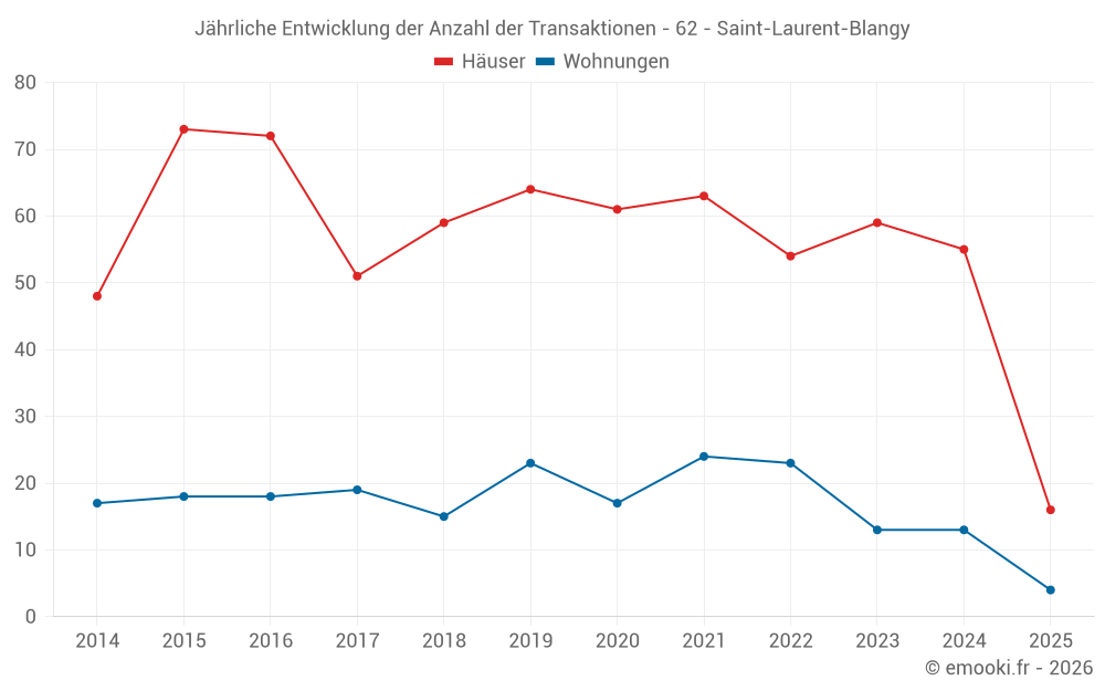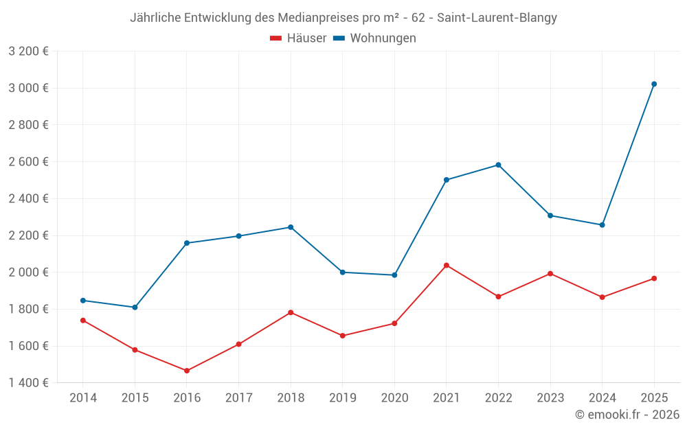 Der Durchschnittspreis auf den 21 Wohnungstransaktionen der letzten 24 Monate in der Gemeinde Saint-Laurent-Blangy betrug 2 677 € pro Quadratmeter für einen mittleren Immobilienwert von 161 000 €. Über diesen Zeitraum hinweg lagen 60% der Transaktionen zwischen 1 685 und 3 104 € pro Quadratmeter (vom 2. bis zum 8. Dezil).
