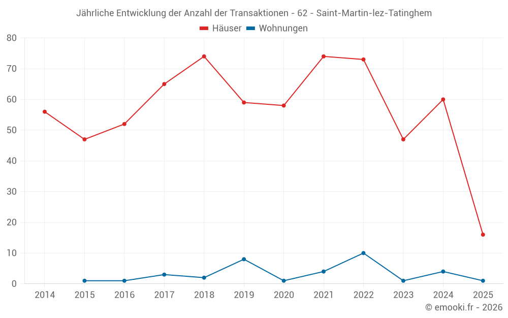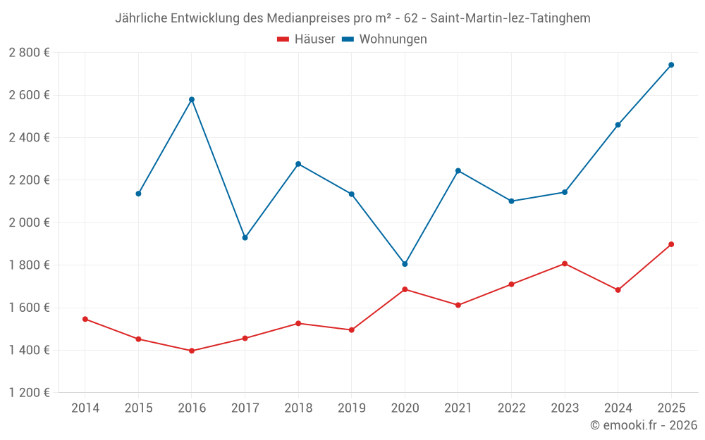 Der Durchschnittspreis auf den 51 Hausgeschäften der letzten 12 Monate in der Gemeinde Saint-Martin-lez-Tatinghem betrug 1 790 € pro Quadratmeter für einen mittleren Immobilienwert von 152 850 €. Über diesen Zeitraum hinweg lagen 60% der Transaktionen zwischen 1 412 und 2 168 € pro Quadratmeter (vom 2. bis zum 8. Dezil).