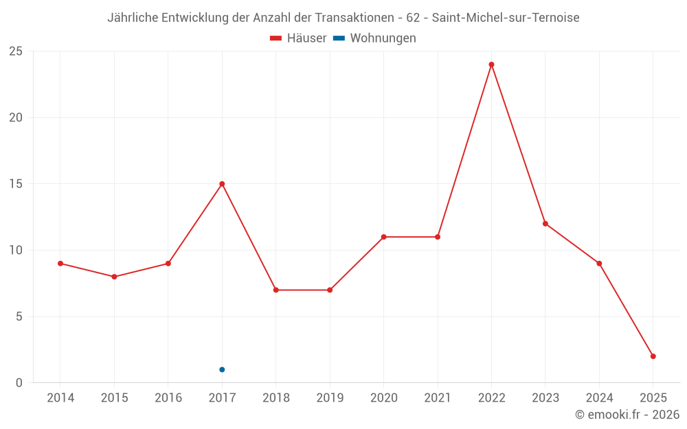 Der Durchschnittspreis auf den 16 Hausgeschäften der letzten 24 Monate in der Gemeinde Saint-Michel-sur-Ternoise betrug 1 132 € pro Quadratmeter für einen mittleren Immobilienwert von 103 350 €. Über diesen Zeitraum hinweg lagen 60% der Transaktionen zwischen 710 und 1 260 € pro Quadratmeter (vom 2. bis zum 8. Dezil).