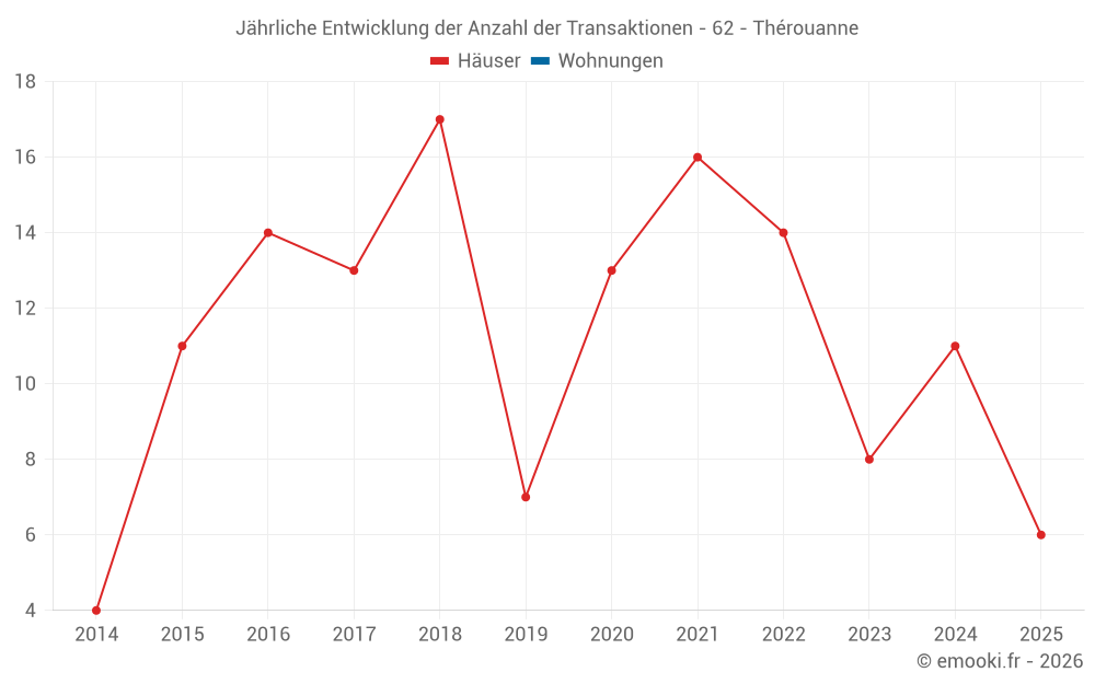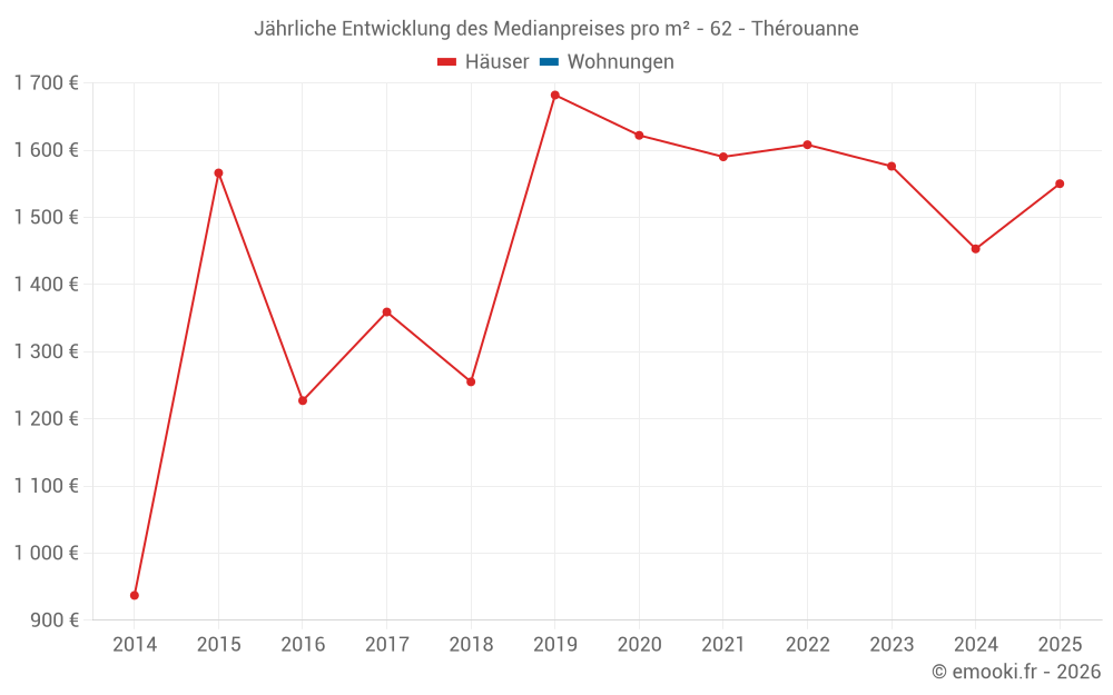 Der Durchschnittspreis auf den 23 Hausgeschäften der letzten 24 Monate in der Gemeinde Thérouanne betrug 1 540 € pro Quadratmeter für einen mittleren Immobilienwert von 165 000 €. Über diesen Zeitraum hinweg lagen 60% der Transaktionen zwischen 950 und 2 210 € pro Quadratmeter (vom 2. bis zum 8. Dezil).