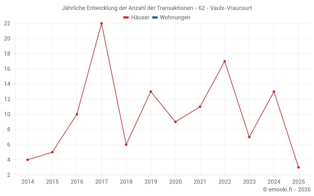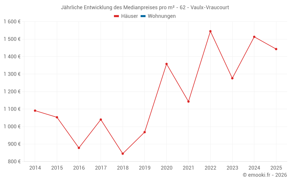 Der Durchschnittspreis auf den 19 Hausgeschäften der letzten 24 Monate in der Gemeinde Vaulx-Vraucourt betrug 1 465 € pro Quadratmeter für einen mittleren Immobilienwert von 130 000 €. Über diesen Zeitraum hinweg lagen 60% der Transaktionen zwischen 1 097 und 2 185 € pro Quadratmeter (vom 2. bis zum 8. Dezil).