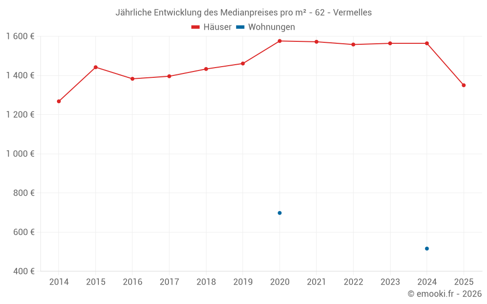 Der Durchschnittspreis auf den 44 Hausgeschäften der letzten 12 Monate in der Gemeinde Vermelles betrug 1 504 € pro Quadratmeter für einen mittleren Immobilienwert von 127 450 €. Über diesen Zeitraum hinweg lagen 60% der Transaktionen zwischen 1 203 und 1 987 € pro Quadratmeter (vom 2. bis zum 8. Dezil).