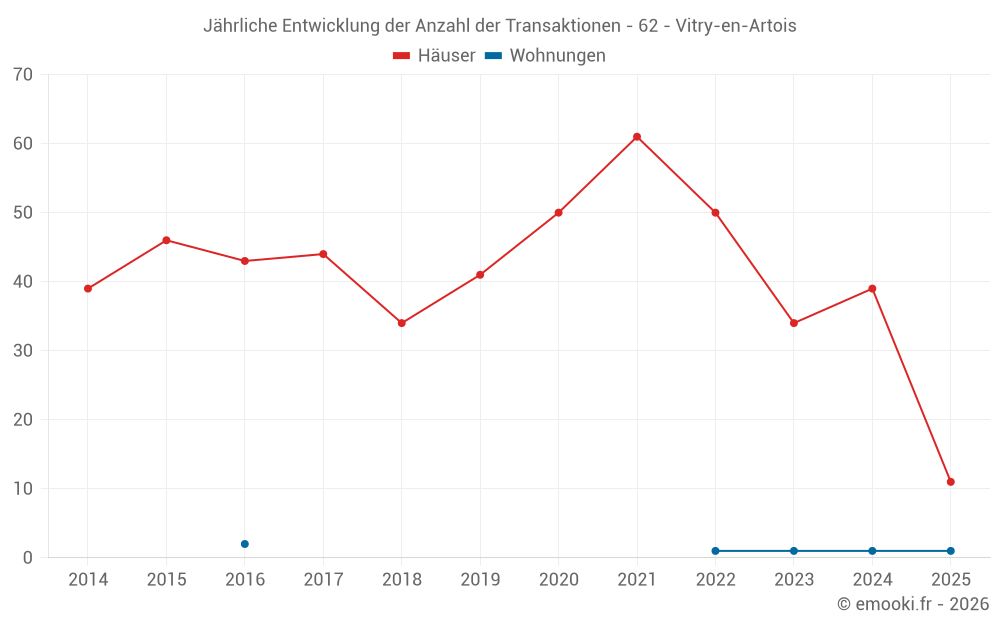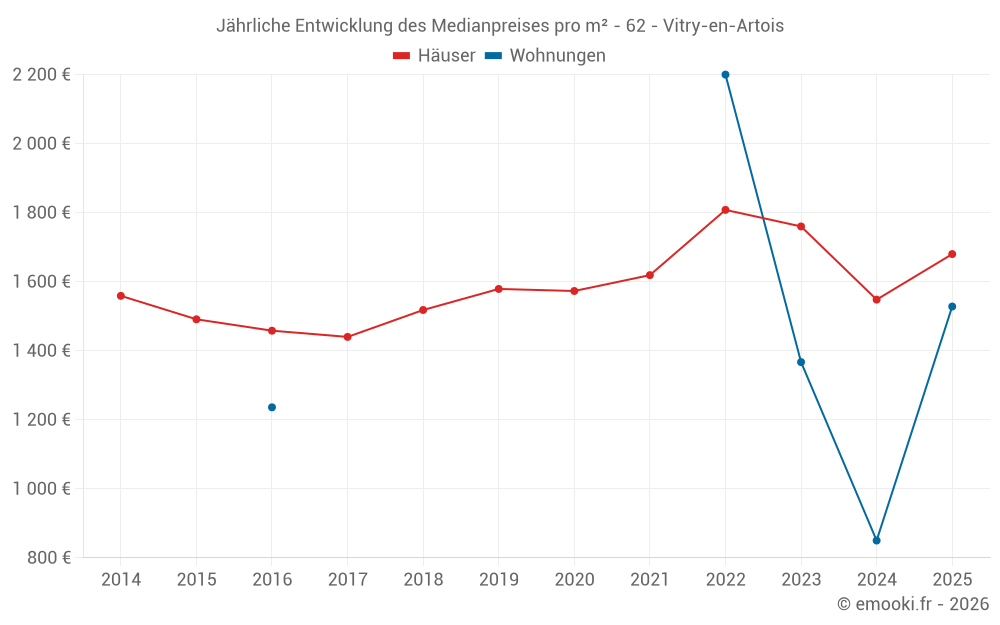Der Durchschnittspreis auf den 32 Hausgeschäften der letzten 12 Monate in der Gemeinde Vitry-en-Artois betrug 1 704 € pro Quadratmeter für einen mittleren Immobilienwert von 151 250 €. Über diesen Zeitraum hinweg lagen 60% der Transaktionen zwischen 969 und 2 116 € pro Quadratmeter (vom 2. bis zum 8. Dezil).