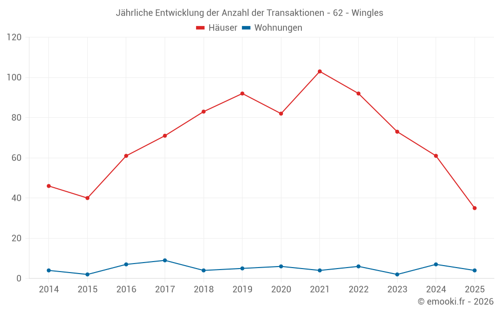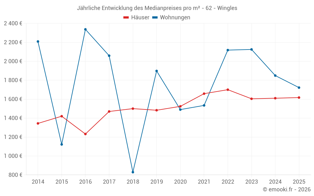 Der Durchschnittspreis auf den 35 Hausgeschäften der letzten 6 Monate in der Gemeinde Wingles betrug 1 617 € pro Quadratmeter für einen mittleren Immobilienwert von 130 000 €. Über diesen Zeitraum hinweg lagen 60% der Transaktionen zwischen 1 277 und 2 128 € pro Quadratmeter (vom 2. bis zum 8. Dezil).