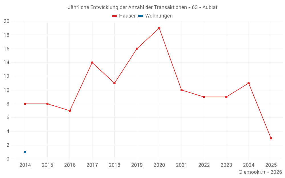Der Durchschnittspreis auf den 21 Hausgeschäften der letzten 24 Monate in der Gemeinde Aubiat betrug 1 807 € pro Quadratmeter für einen mittleren Immobilienwert von 140 200 €. Über diesen Zeitraum hinweg lagen 60% der Transaktionen zwischen 1 296 und 2 143 € pro Quadratmeter (vom 2. bis zum 8. Dezil).