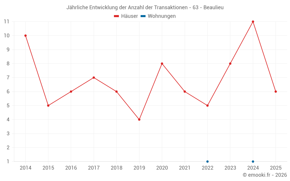 Der Durchschnittspreis auf den 21 Hausgeschäften der letzten 24 Monate in der Gemeinde Beaulieu betrug 1 113 € pro Quadratmeter für einen mittleren Immobilienwert von 91 650 €. Über diesen Zeitraum hinweg lagen 60% der Transaktionen zwischen 536 und 1 869 € pro Quadratmeter (vom 2. bis zum 8. Dezil).