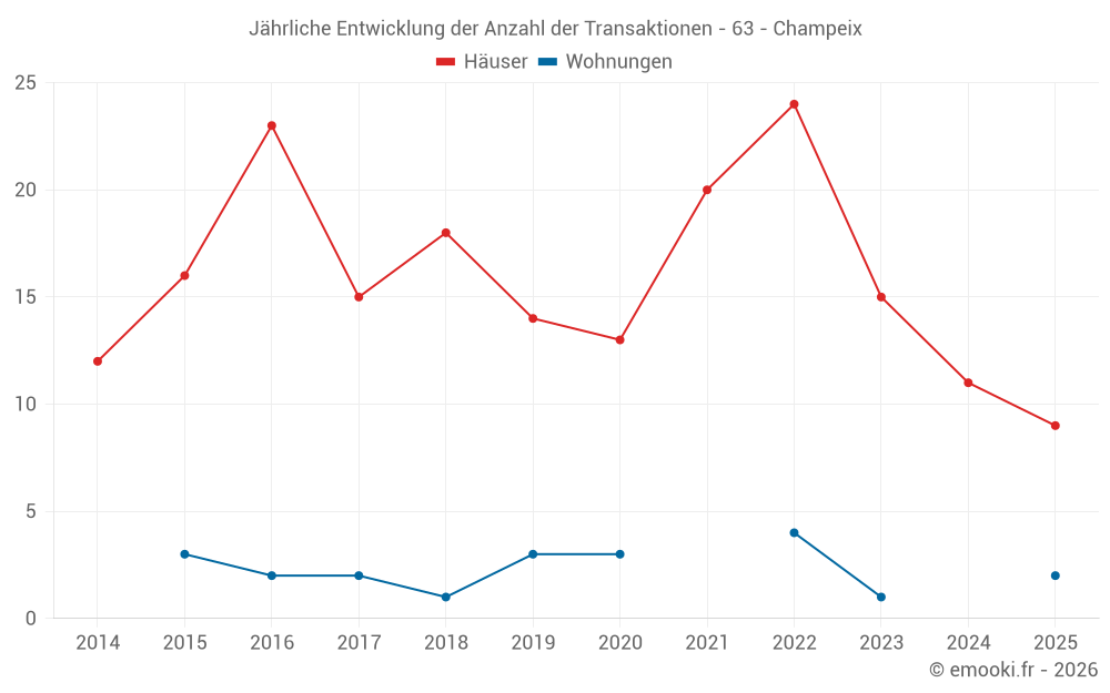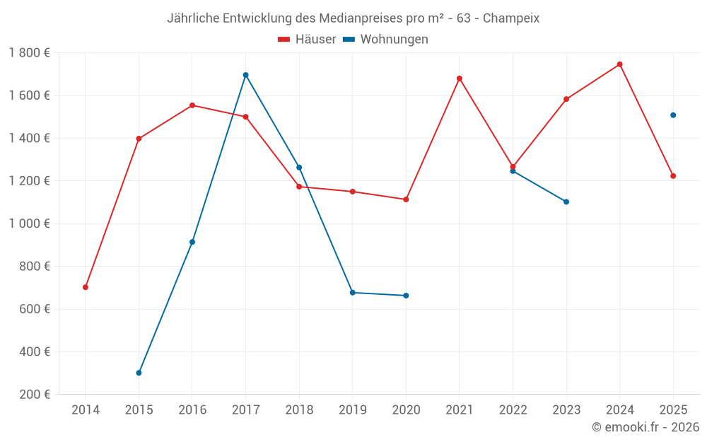 Der Durchschnittspreis auf den 29 Hausgeschäften der letzten 24 Monate in der Gemeinde Champeix betrug 1 377 € pro Quadratmeter für einen mittleren Immobilienwert von 130 000 €. Über diesen Zeitraum hinweg lagen 60% der Transaktionen zwischen 645 und 1 850 € pro Quadratmeter (vom 2. bis zum 8. Dezil).