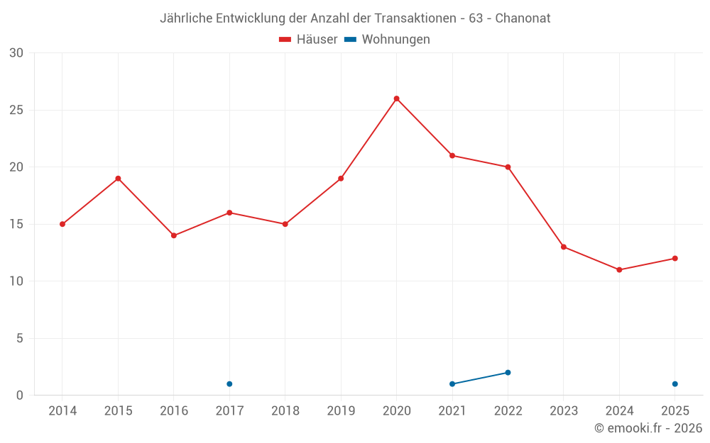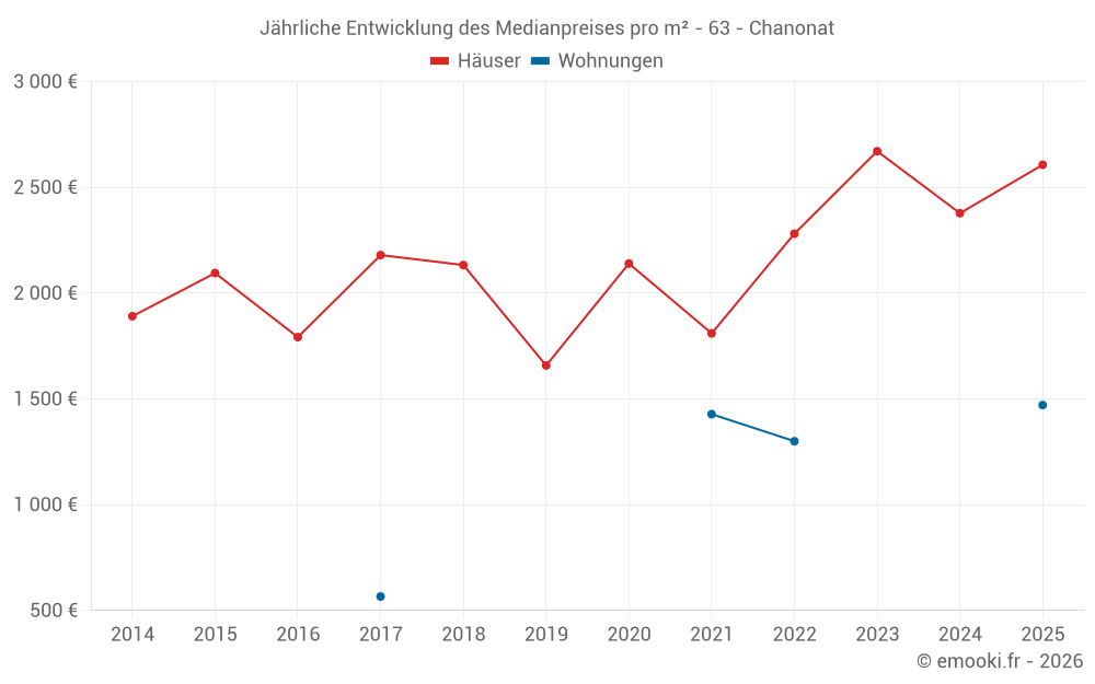 Der Durchschnittspreis auf den 18 Hausgeschäften der letzten 12 Monate in der Gemeinde Chanonat betrug 2 408 € pro Quadratmeter für einen mittleren Immobilienwert von 295 956 €. Über diesen Zeitraum hinweg lagen 60% der Transaktionen zwischen 1 549 und 2 880 € pro Quadratmeter (vom 2. bis zum 8. Dezil).