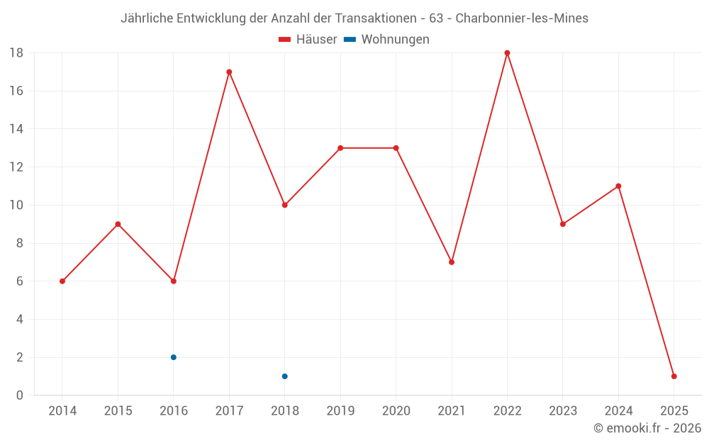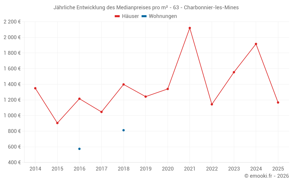 Der Durchschnittspreis auf den 20 Hausgeschäften der letzten 24 Monate in der Gemeinde Charbonnier-les-Mines betrug 1 820 € pro Quadratmeter für einen mittleren Immobilienwert von 154 775 €. Über diesen Zeitraum hinweg lagen 60% der Transaktionen zwischen 941 und 2 022 € pro Quadratmeter (vom 2. bis zum 8. Dezil).