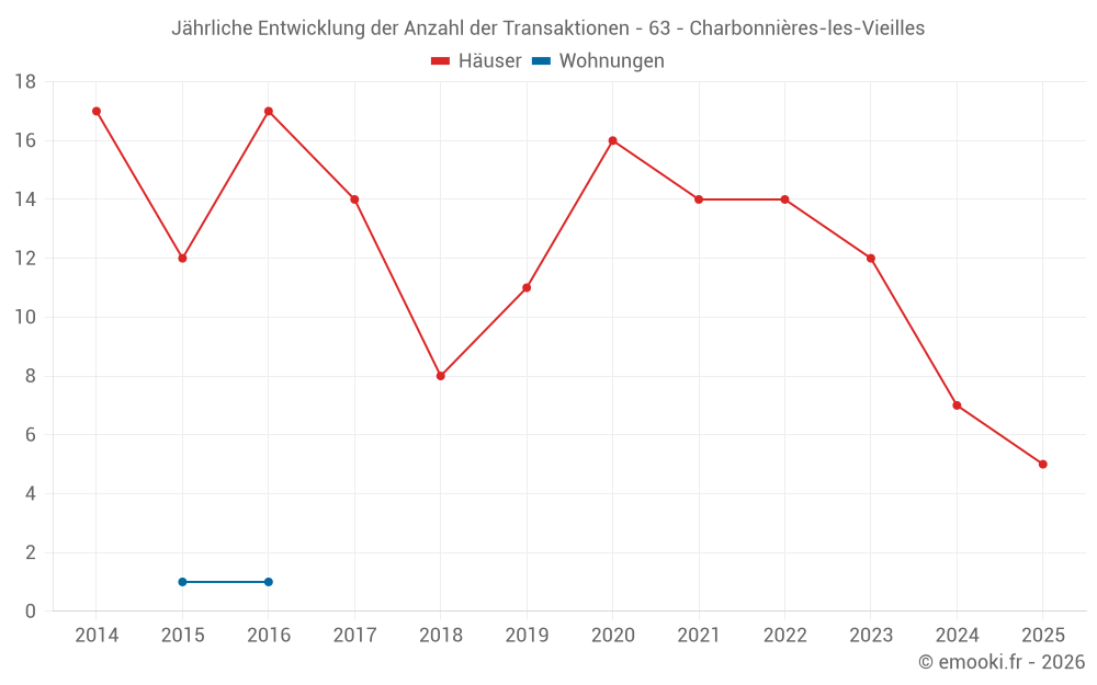 Der Durchschnittspreis auf den 19 Hausgeschäften der letzten 24 Monate in der Gemeinde Charbonnières-les-Vieilles betrug 1 056 € pro Quadratmeter für einen mittleren Immobilienwert von 88 000 €. Über diesen Zeitraum hinweg lagen 60% der Transaktionen zwischen 339 und 2 262 € pro Quadratmeter (vom 2. bis zum 8. Dezil).