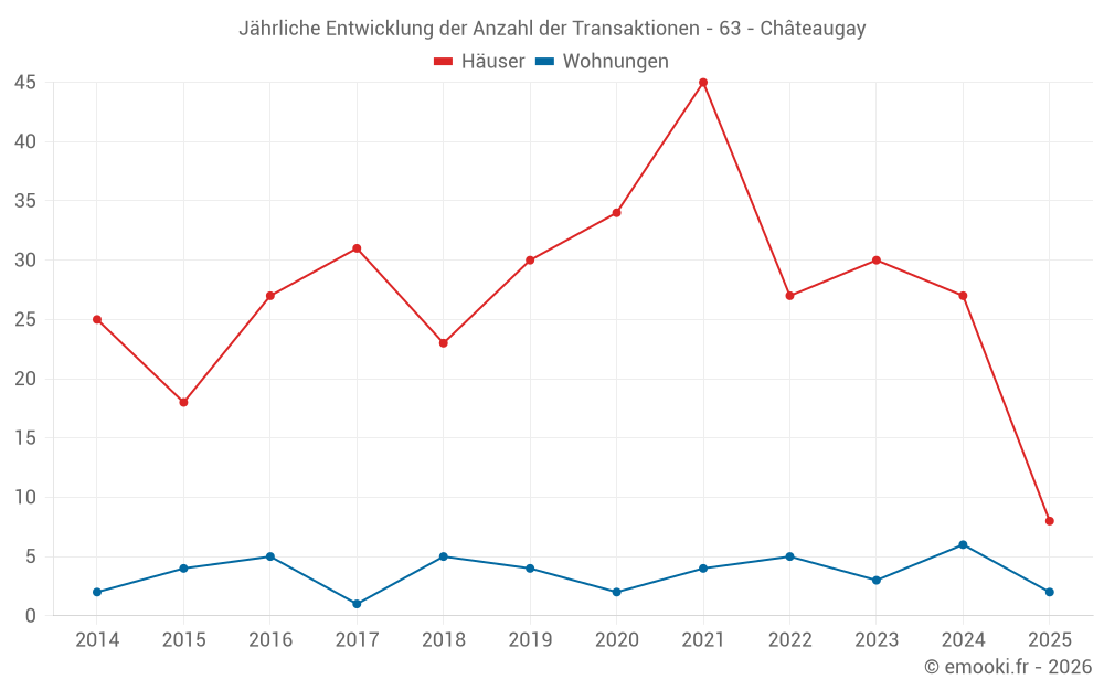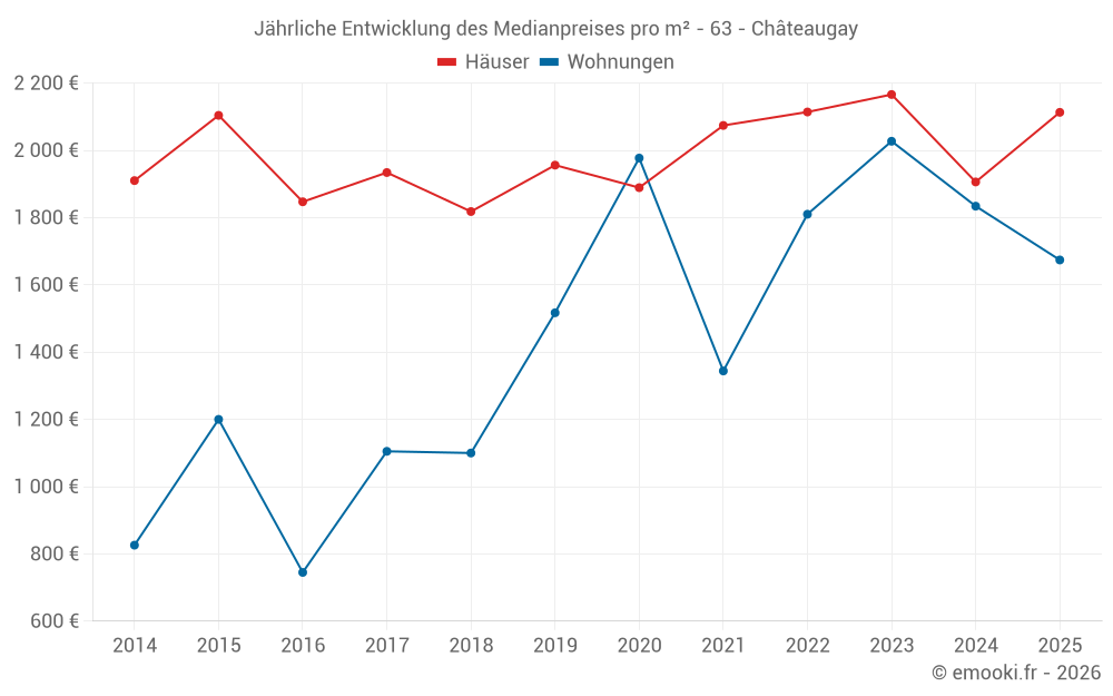 Der Durchschnittspreis auf den 26 Hausgeschäften der letzten 12 Monate in der Gemeinde Châteaugay betrug 1 774 € pro Quadratmeter für einen mittleren Immobilienwert von 196 665 €. Über diesen Zeitraum hinweg lagen 60% der Transaktionen zwischen 1 292 und 2 560 € pro Quadratmeter (vom 2. bis zum 8. Dezil).
