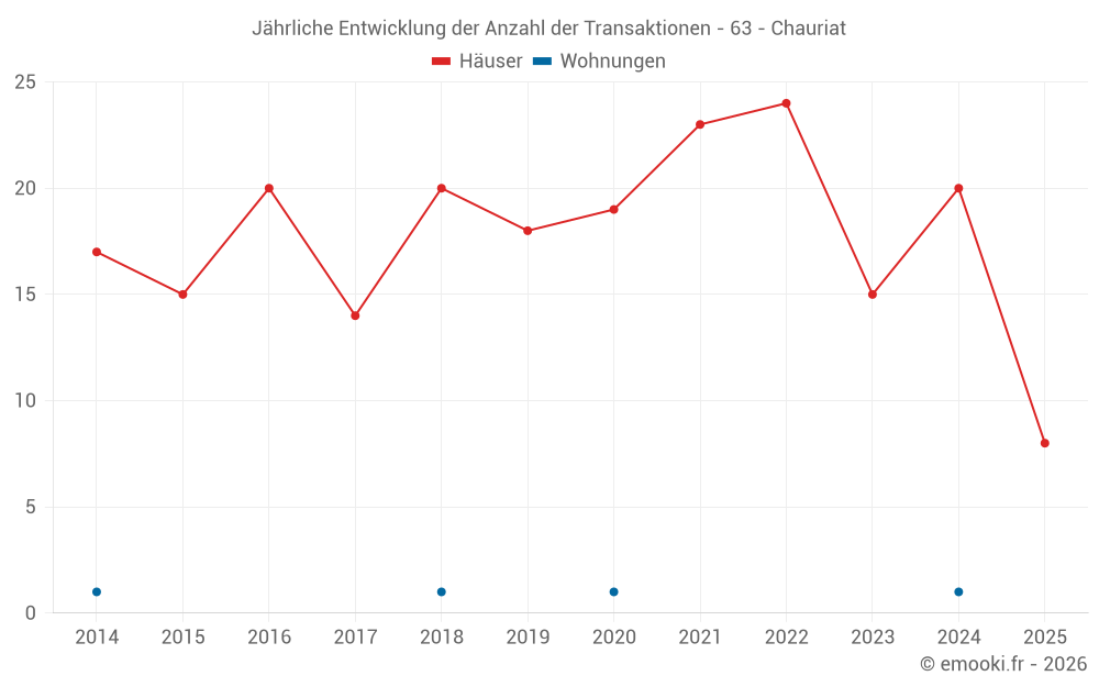 Der Durchschnittspreis auf den 20 Hausgeschäften der letzten 12 Monate in der Gemeinde Chauriat betrug 2 084 € pro Quadratmeter für einen mittleren Immobilienwert von 164 775 €. Über diesen Zeitraum hinweg lagen 60% der Transaktionen zwischen 1 430 und 2 635 € pro Quadratmeter (vom 2. bis zum 8. Dezil).