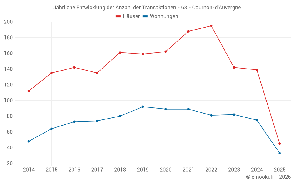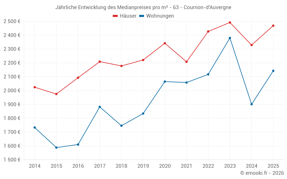 Der Durchschnittspreis auf den 45 Hausgeschäften der letzten 6 Monate in der Gemeinde Cournon-d'Auvergne betrug 2 469 € pro Quadratmeter für einen mittleren Immobilienwert von 225 000 €. Über diesen Zeitraum hinweg lagen 60% der Transaktionen zwischen 1 974 und 2 915 € pro Quadratmeter (vom 2. bis zum 8. Dezil).