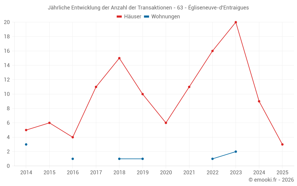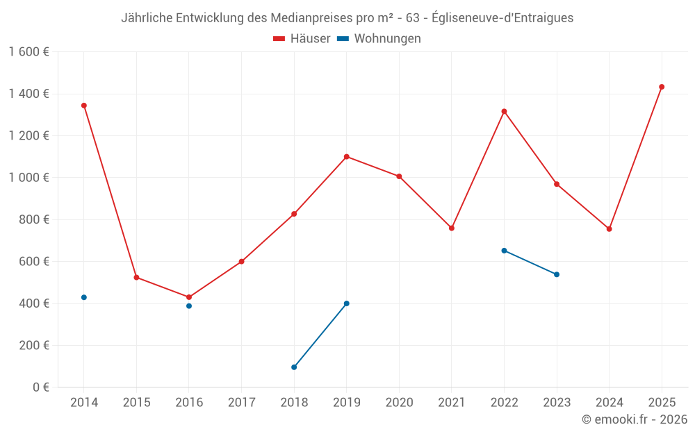 Der Durchschnittspreis auf den 23 Hausgeschäften der letzten 24 Monate in der Gemeinde Égliseneuve-d'Entraigues betrug 971 € pro Quadratmeter für einen mittleren Immobilienwert von 56 600 €. Über diesen Zeitraum hinweg lagen 60% der Transaktionen zwischen 631 und 1 536 € pro Quadratmeter (vom 2. bis zum 8. Dezil).