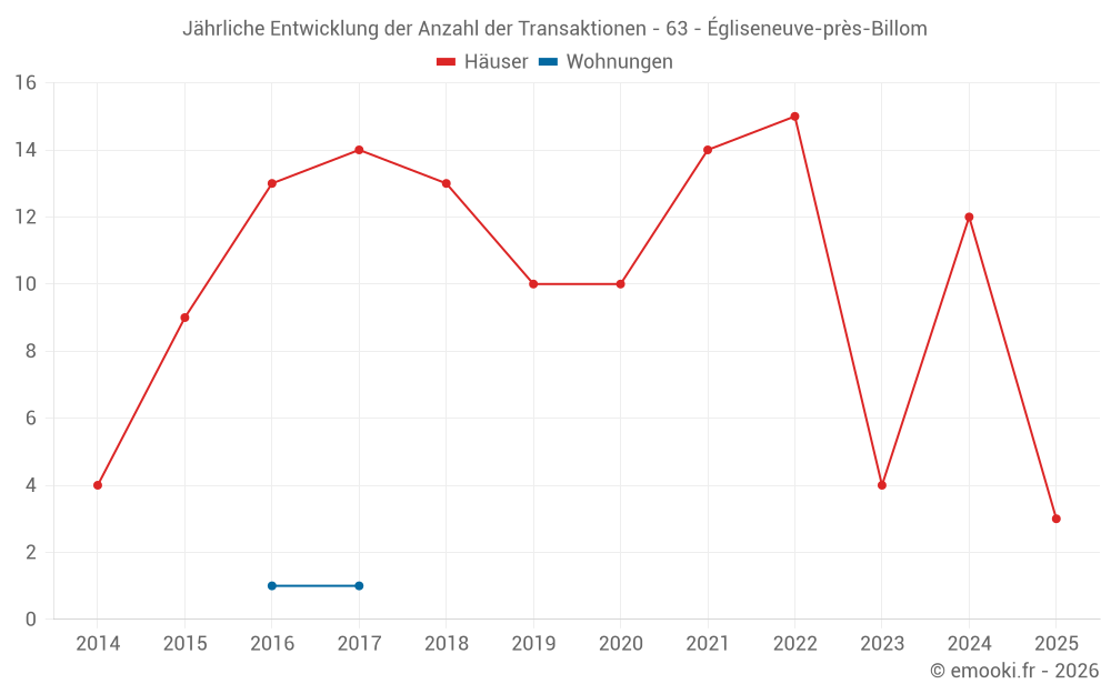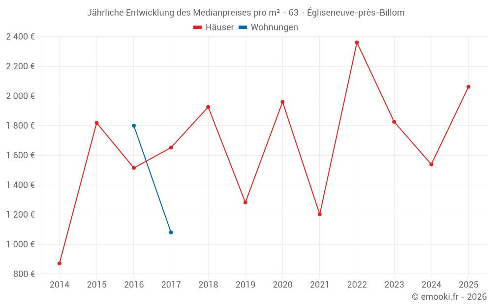 Der Durchschnittspreis auf den 17 Hausgeschäften der letzten 24 Monate in der Gemeinde Égliseneuve-près-Billom betrug 1 879 € pro Quadratmeter für einen mittleren Immobilienwert von 199 800 €. Über diesen Zeitraum hinweg lagen 60% der Transaktionen zwischen 1 112 und 2 327 € pro Quadratmeter (vom 2. bis zum 8. Dezil).