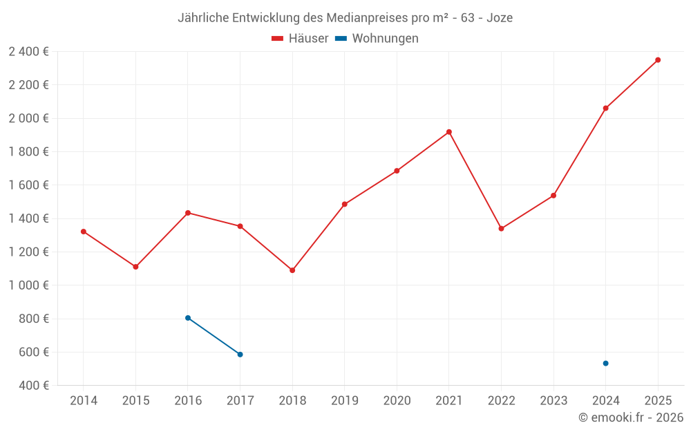 Der Durchschnittspreis auf den 18 Hausgeschäften der letzten 24 Monate in der Gemeinde Joze betrug 1 821 € pro Quadratmeter für einen mittleren Immobilienwert von 149 450 €. Über diesen Zeitraum hinweg lagen 60% der Transaktionen zwischen 1 115 und 2 351 € pro Quadratmeter (vom 2. bis zum 8. Dezil).