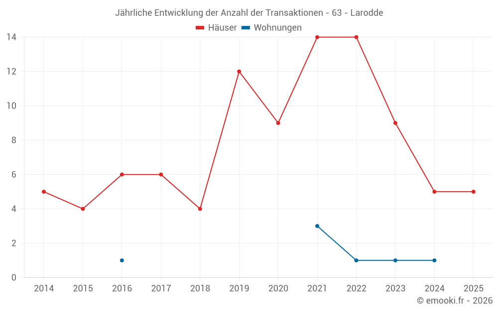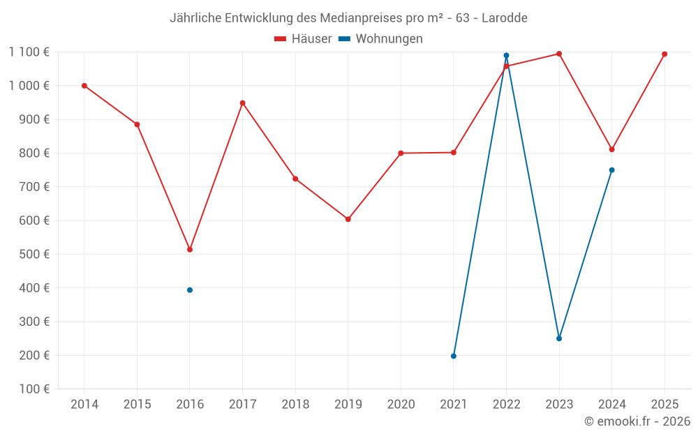 Der Durchschnittspreis auf den 14 Hausgeschäften der letzten 24 Monate in der Gemeinde Larodde betrug 1 115 € pro Quadratmeter für einen mittleren Immobilienwert von 91 325 €. Über diesen Zeitraum hinweg lagen 60% der Transaktionen zwischen 654 und 1 341 € pro Quadratmeter (vom 2. bis zum 8. Dezil).